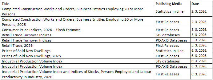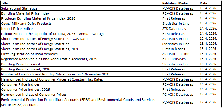 A precise overview of publication dates for all data issued by the Croatian Bureau of Statistics is available in the interactive Calendar of Statistical Data Issues.
