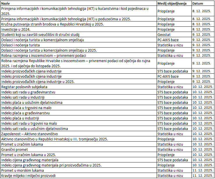 Tjedni kalendar objavljivanja statističkih podataka, 8. - 12. prosinca 2025.