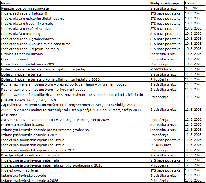 Precizan pregled rokova objavljivanja svih podataka što ih objavljuje Državni zavod za statistiku možete pronaći u interaktivnom Kalendaru objavljivanja statističkih podataka.