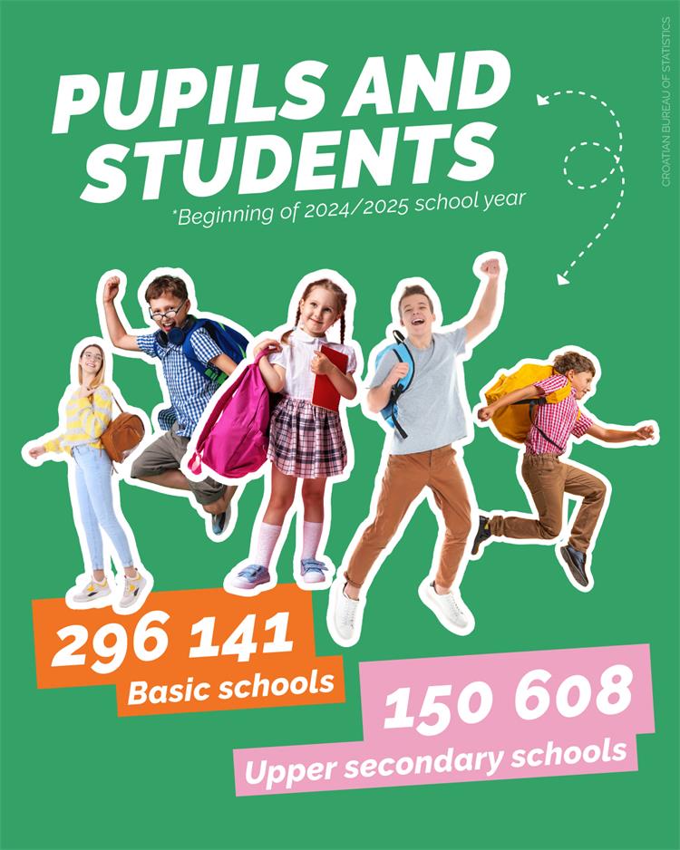 At the beginning of the 2024/2025 school year, Croatia had 1 945 regular basic schools and 102 basic schools for disabled children and youth. A total of 296 141 pupils attended classes in these schools, including 35 881 first-graders starting their basic education for the first time. Of these first-graders, 18.1% were younger than seven years old. In the same school year, there were 37 826 teachers working in basic schools, of whom 82.3% were women.