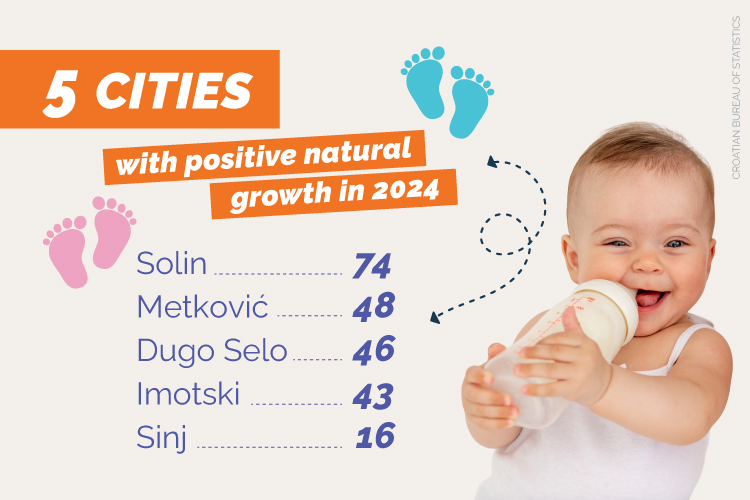 According to the latest population estimate in mid-2024, there were 692 835 persons aged 0 - 18 living in Croatia, and 32 069 children were born alive in the same year. More boys (51.7%) were born than girls (48.3%). Although 0.3% fewer children (101 fewer children) were born compared to 2023, there are still some cities that are proud of having achieved a positive natural increase in 2024 (more births than deaths).