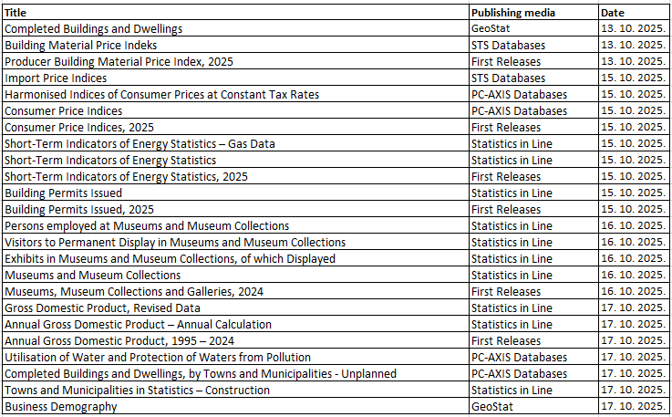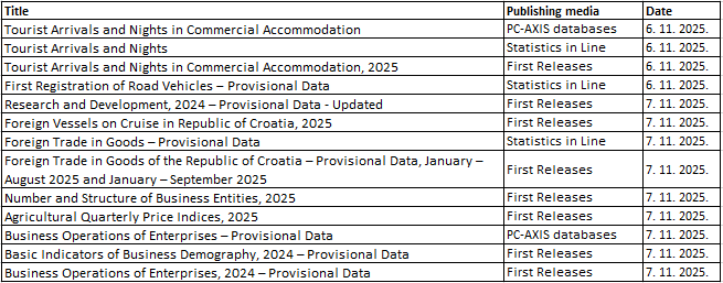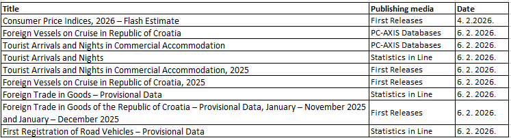 A precise overview of publication dates for all data issued by the Croatian Bureau of Statistics is available in the interactive Calendar of Statistical Data Issues.