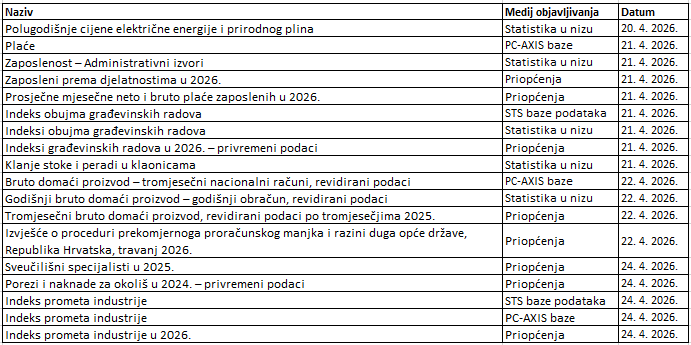 Tjedni kalendar objavljivanja statističkih podataka, 20. - 24. travnja 2026.