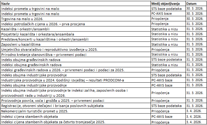 Tjedni kalendar objavljivanja statističkih podataka, 30. ožujka - 3. travnja 2026.