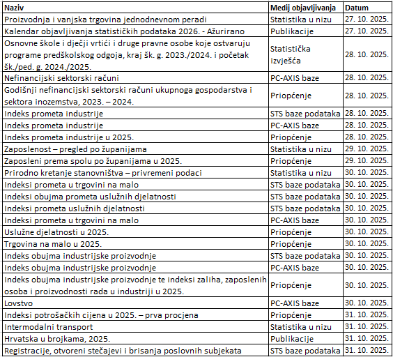 Tjedni kalendar objavljivanja statističkih podataka, 27. - 31. listopada 2025.